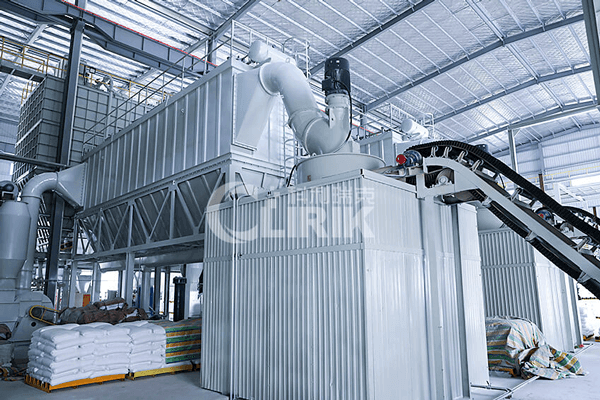 主機電機通過減速機帶動碾盤轉動,同時高壓風機生產的氣流從風口進入主機,物料經喂料螺旋送入立磨主機內落入碾盤中央,在離心機的作用下,物料從碾盤中央向四周散開,經過碾盤上的輥道區域時,受到輥壓力,大塊物料被直接壓碎,小顆粒物受壓后再進行粒見研磨起到進一步粉碎作用,直至成粉。成粉后的物料繼續向碾盤邊緣移動,直到被進風口的強氣流帶走,氣流中的物料經過上部選粉機時,在高速旋轉的葉輪產生的離心力作用下,粗顆粒重新落入碾盤碾磨,合格粉體隨氣流穿過選粉系統后被除塵器收集,即為成品。